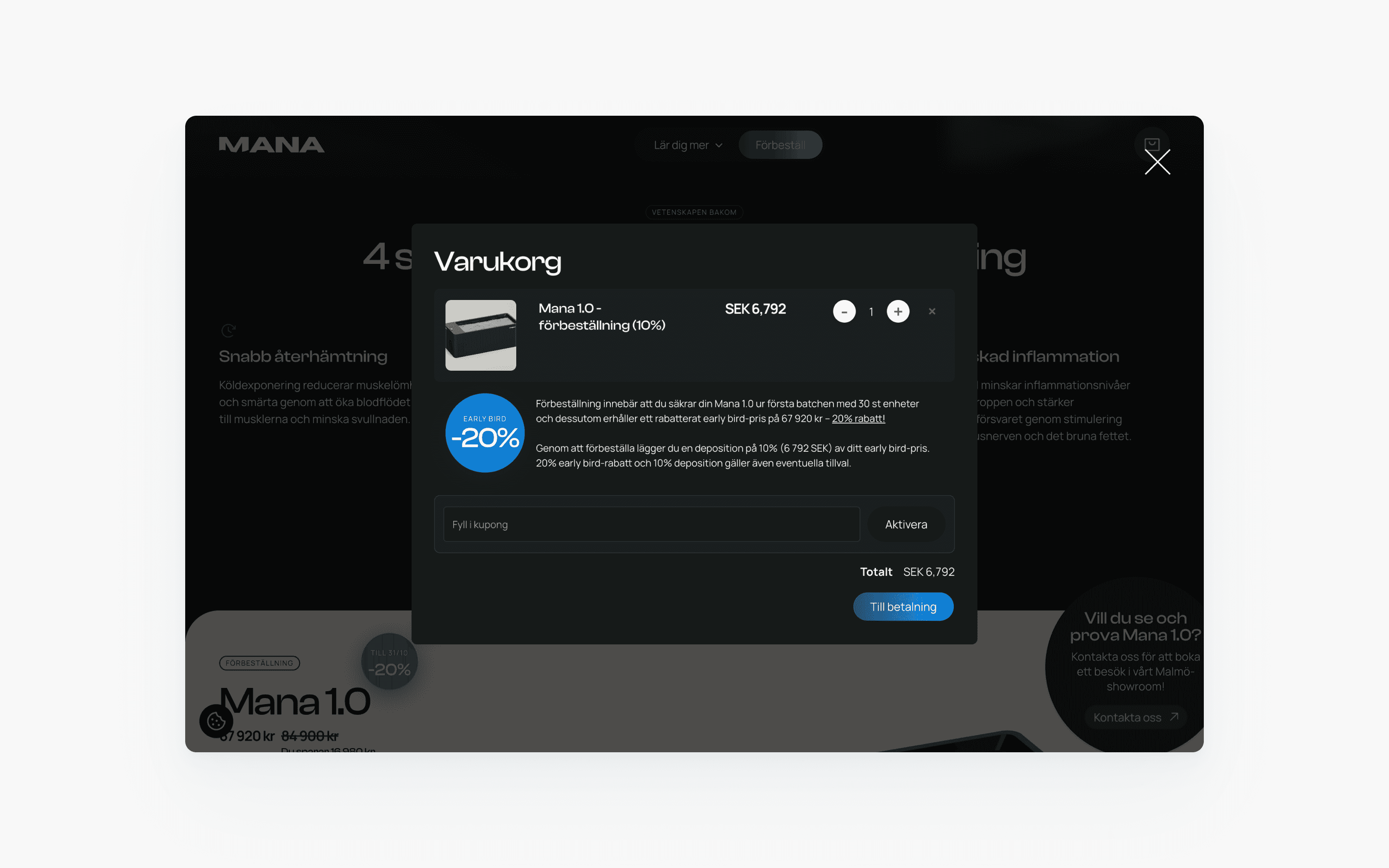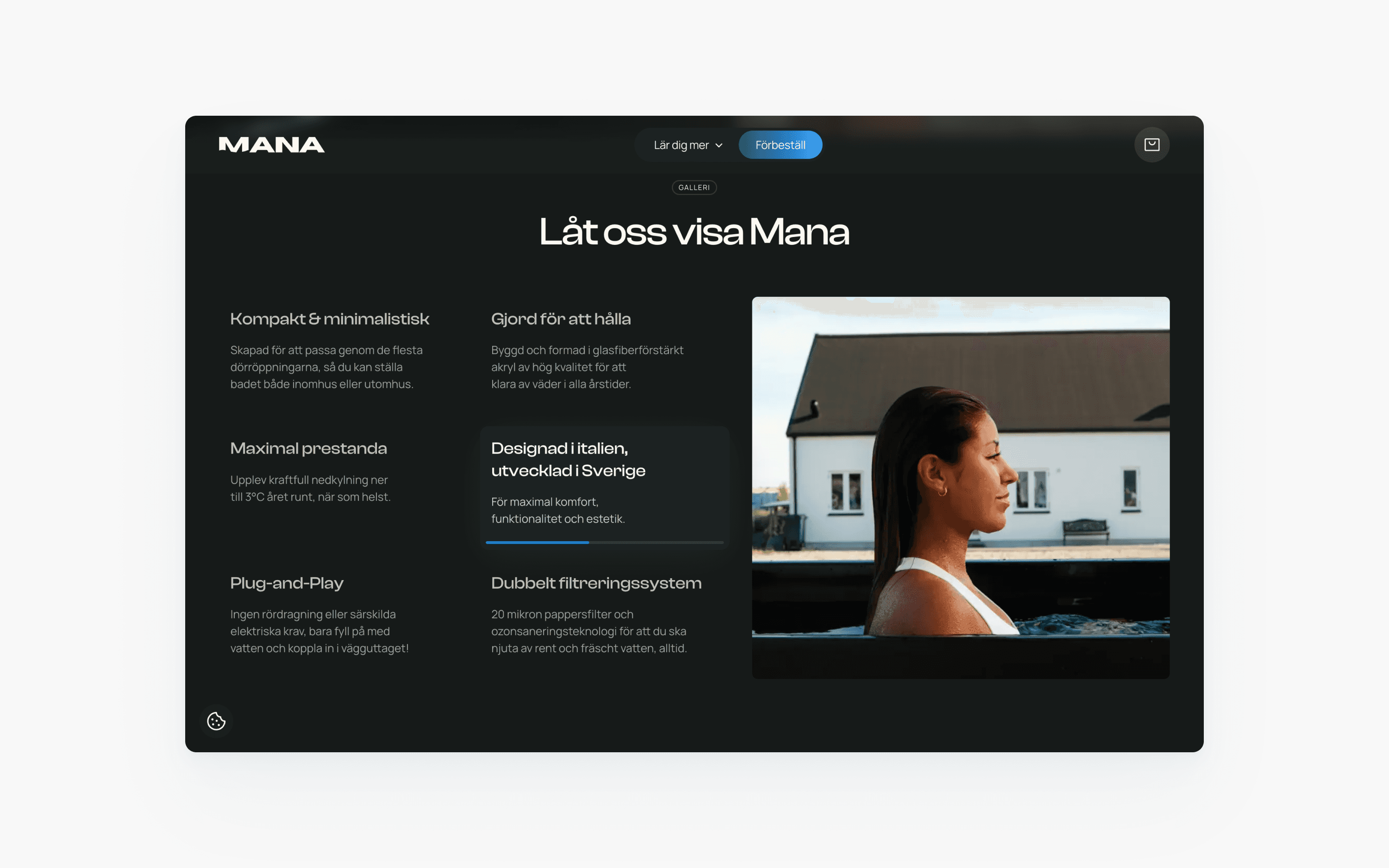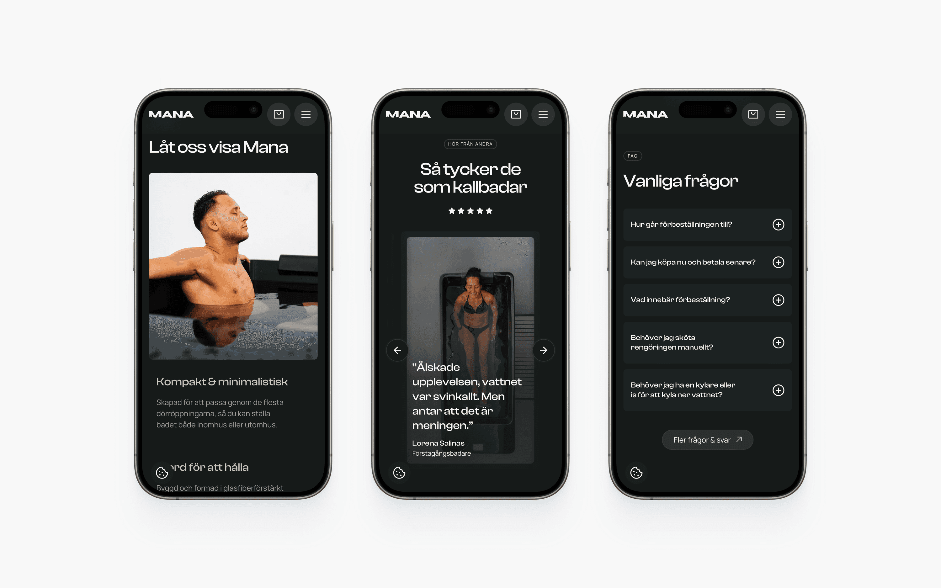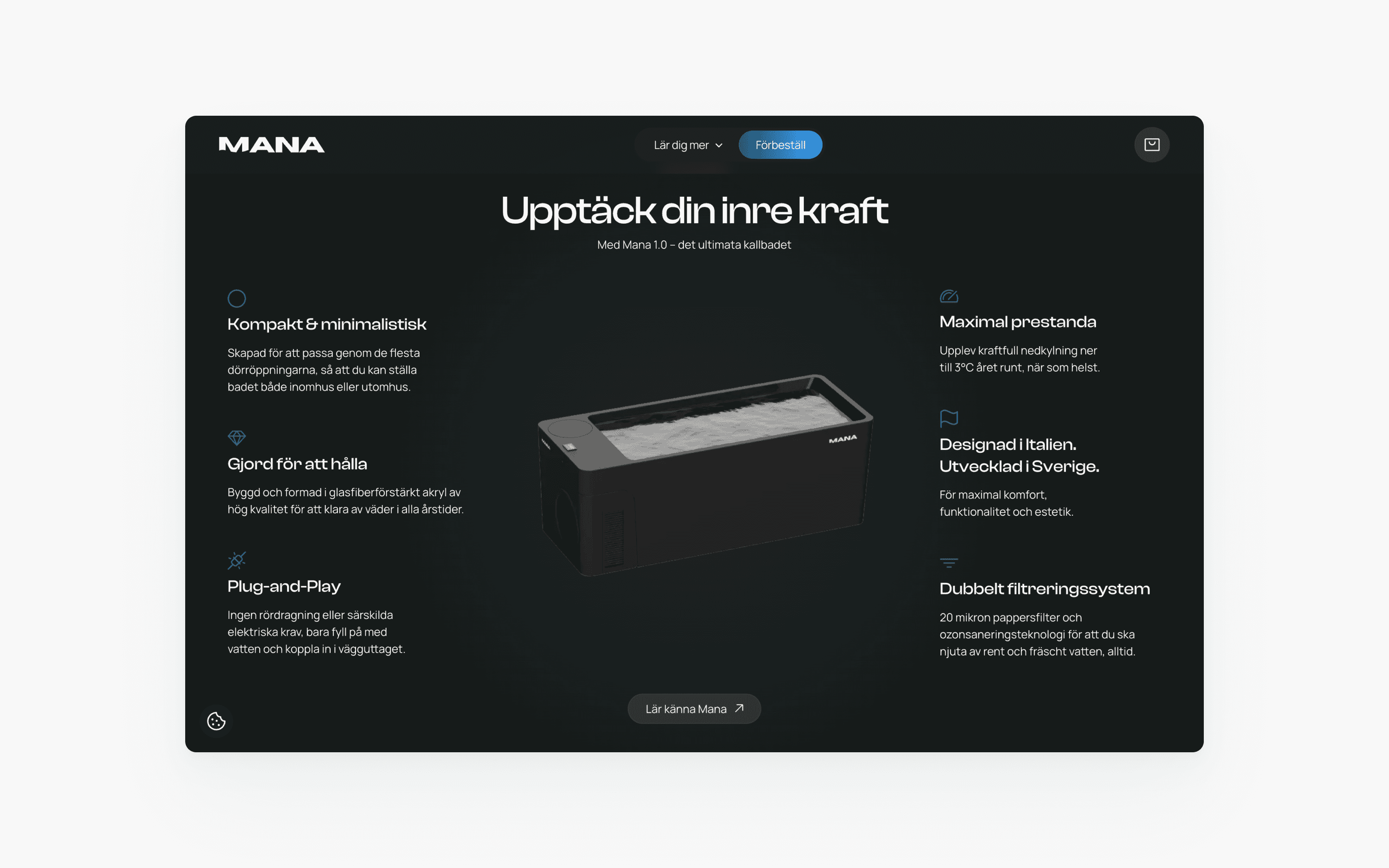 Manas högteknologiska kallbad möjliggör uppfriskande och välgörande kallbad året runt. Jag hjälpte Mana att integrera e-handel från Shopify med Webflow som CMS.